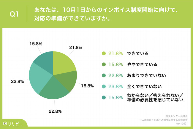 「Q1.あなたは、10月1日からのインボイス制度開始に向けて、対応の準備ができていますか。」(n=101)と質問したところ、「できている」が21.8%、「ややできている」が15.8%という回答となりました。