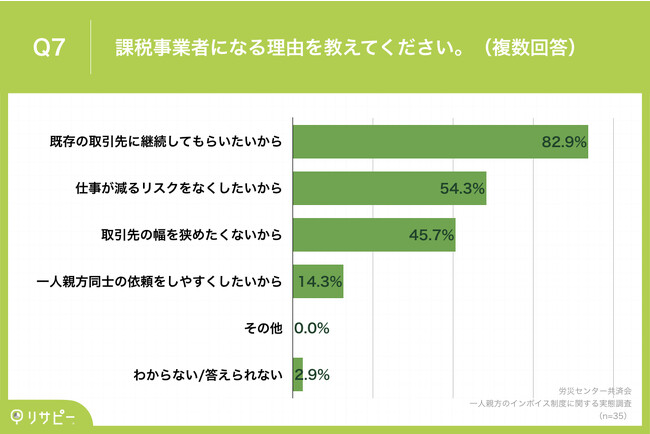 Q6で「課税事業者になる予定」と回答した方に、「Q7.課税事業者になる理由を教えてください。(複数回答)」(n=35)と質問したところ、「既存の取引先に継続してもらいたいから」が82.9%、「仕事が減るリスクをなくしたいから」が54.3%、「取引先の幅を狭めたくないから」が45.7%という回答となりました。