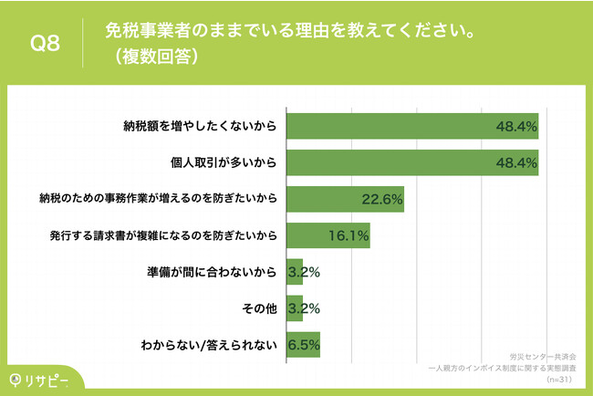 Q6で「免税事業者のままでいる予定」と回答した方に、「Q8.免税事業者のままでいる理由を教えてください。(複数回答)」(n=31)と質問したところ、「納税額を増やしたくないから」が48.4%、「個人取引が多いから」が48.4%、「納税のための事務作業が増えるのを防ぎたいから」が22.6%という回答となりました。