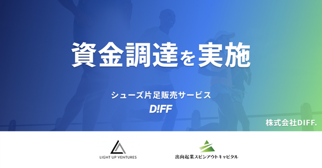 ビジョン「足が喜ぶ、あしたをつくる。」を掲げてシューズ片足購買サービス『DIFF.』の運営を行う株式会社DIFF.(本社:大阪市北区、代表取締役:清水雄一)は、ライトアップベンチャーズ(本社:大阪市都島区、代表組合員:中村忠嗣)と出向起業スピンアウトキャピタル(本社:東京都中央区、表組合員:奥山恵太)から2000万円の資金調達を実施しました。2024年9月までに400足/月の販売を目標として、様々なステークホルダーのビジョンへの巻き込みおよびDIFF.ファンの獲得に注力してまいります。