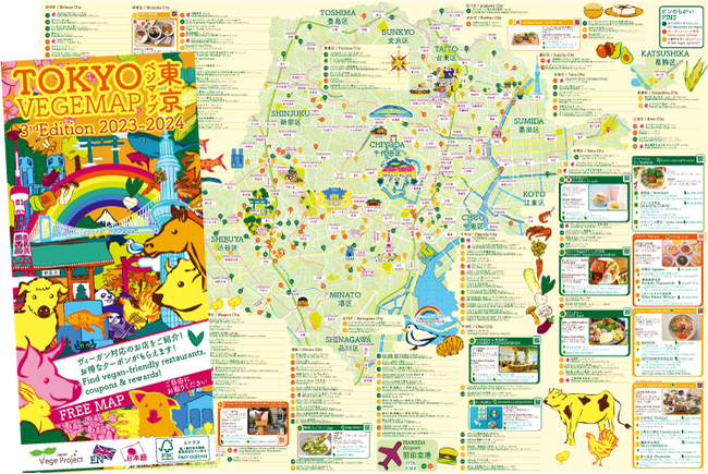 NPO法人ベジプロジェクトジャパンは、東京都内のヴィーガングルメのガイドマップ「東京ベジマップ 2023-2024」(第3版)をリリースしました。過去最多の200店を掲載し、ヴィーガンスイーツや割引、ドリンクサービスなどの特典を利用できるクーポンの内容もより充実しています。