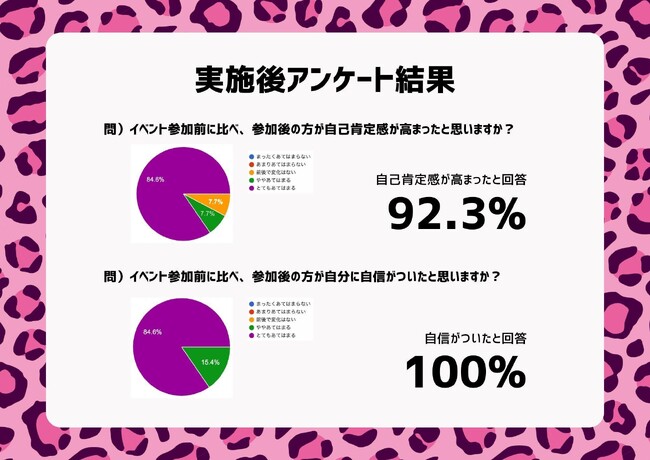 イベント後に実施したアンケートでは、「イベント参加前に比べ、参加後の方が自己肯定感が高まったと思いますか?」という質問に対し、「高まった」と回答した人は92.3%という結果に。「自信がついたと思いますか?」に対しては、「自信がついた」と回答した人は100%とポジティブな回答をいただきました。