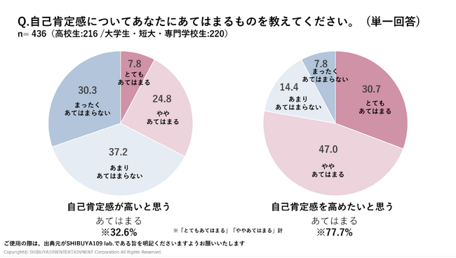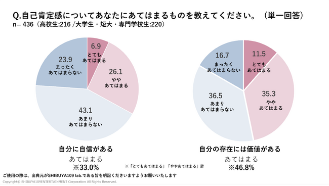 SHIBUYA109 lab.がZ世代(15歳から24歳の女性)に向けて実施した調査(※1)によると、左側の「自己肯定感についてあなたにあてはまるものを教えてください。」という質問に対して、「自分に自信がある」と回答したのは33.0%でした。