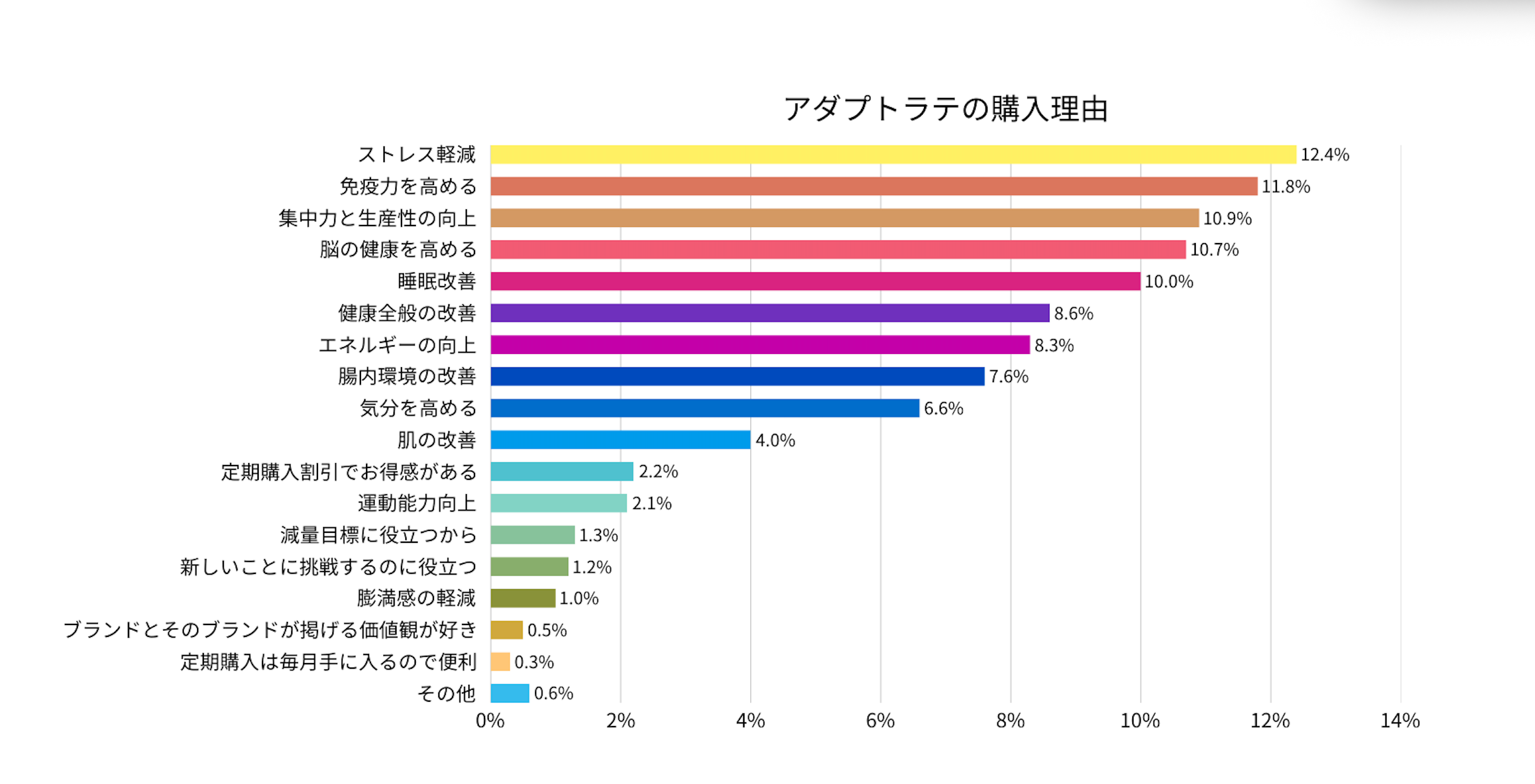 このデータからは、マッシュルームコーヒーに対し、単なるリラックスだけでなく「メンタルの安定」や「仕事のパフォーマンス維持」そして「基礎的な体調管理」という、現代人が抱える切実な課題への『機能的な解決策』が求められていることが読み取れます。
