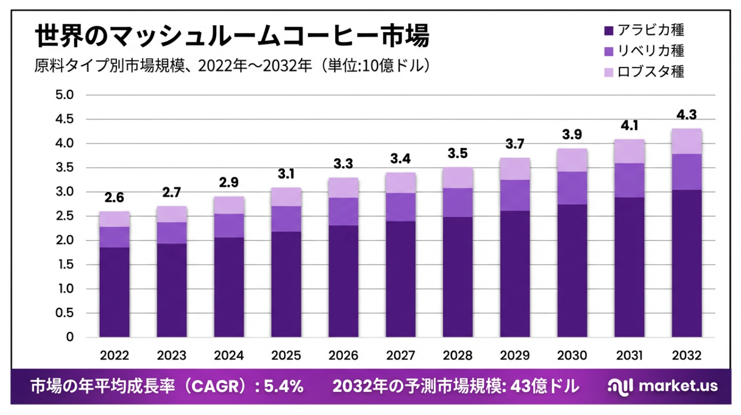 今、アメリカやヨーロッパを中心に、健康意識の高い人々の間で「コーヒーの次世代スタンダード」として爆発的に普及しているのが、マッシュルームコーヒーです。 その市場規模は2030年には世界で約43億米ドル(約6,700億円)に達すると予測されるほど(※)、世界的なウェルネストレンドとなっています。