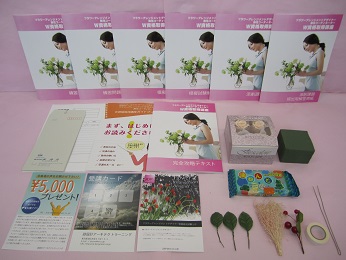 内容:ガイドブック、受講証、受講カード、フラワーアレンジメントデザイナー対策コース完全攻略テキスト、練習問題集/解答、模擬試験/解答、添削課題(5回分)、質問用紙、封筒、フラワーアレンジメント材料一式,お仕事お役立ちブック(講座修了時),卒業課題(※スペシャル講座のみ)