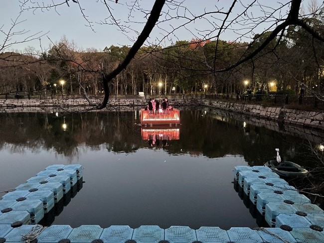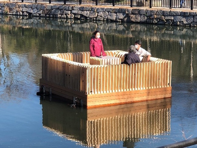 今回の実証実験では、海床ロボットコンソーシアムが開発する純国産制御システム搭載の「海床ロボット」を、大阪・関西万博の会場である夢洲内の水域に見立てて大阪城公園の東外堀に浮かべ、新しいモビリティの活用可能性を検証しました。「海床ロボット」は、海や運河・河川並びに湖沼などの水面に浮かべた床(3m四方)が自動で動き、離着岸する自動運転船です。