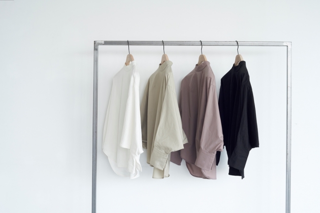 CNLZで定評のあるシャツを中心とした従来のアイテムに、坂口の手掛けるジャケットやコート、ワンピース