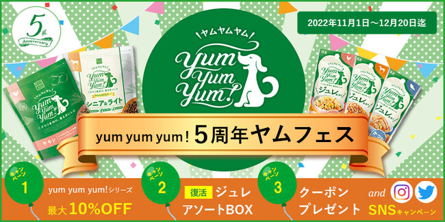 株式会社カラーズ(本社:兵庫県神戸市、代表取締役社長:伊東 竜太)が運営するペットショップGREEN DOGは、素材の香りを感じられるほど品質とおいしさにこだわったドッグフードブランド「yum yum yum!(ヤムヤムヤム)」の発売5周年を記念して、2022年11月1日(火)より「yum yum yum! 5周年 ヤムフェス」を開催いたします。