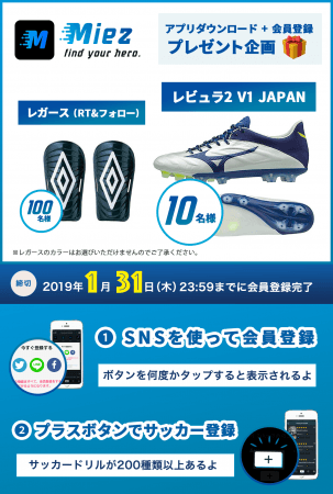 エントリーするには、期間内に(A)「Miez」のアプリをダウンロードして、カテゴリとしてサッカーを登録する、(B)TwitterでMiez公式アカウントの投稿をフォロー&RTする必要があります。