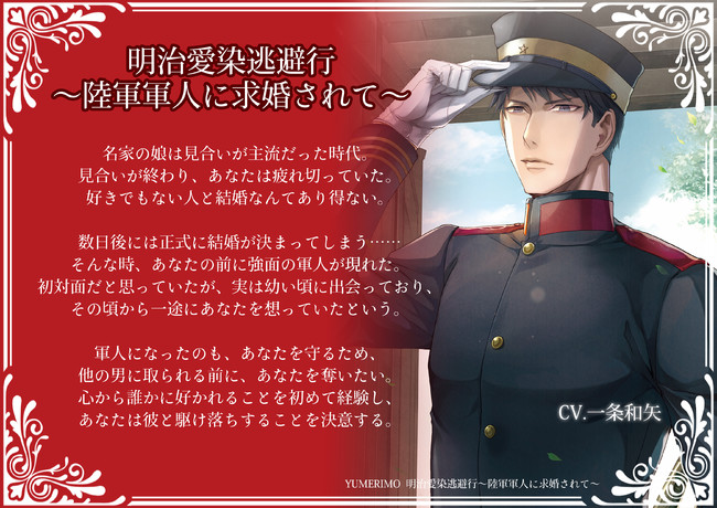 株式会社Julyが運営するレーベル「YUMERIMO」より、新作シチュエーション音声「明治愛染逃避行〜陸軍軍人に求婚されて〜」発売いたしました!