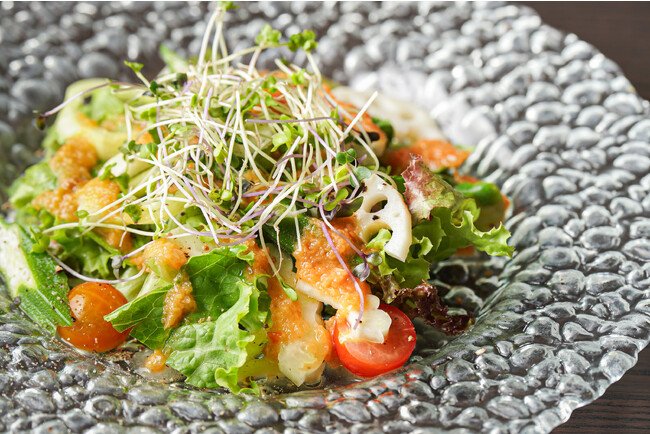 食材の良さを最大限に生かした感動のコース料理が誕生。価格は5品で3,000円(税抜)。自家製ドレッシングは米油と果実(りんごとトマトがベース)が1:1。セミドライトマトには米油をふりかけ低温仕上げに。その他すべての料理に米油が使用しており、シェフのこだわりが詰まったコース料理になっています。詳細につきましては、試食会取材記事をご覧ください。