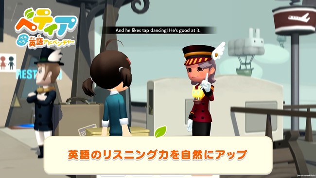 『ベティア ペラペラ英語アドベンチャー』は、ゲーム内の登場人物たちとの「聴く」「喋る」「書く」といったコミュニケーション、バトル、アイテム集めなどで、遊びながら正しい発音で日常英会話が身につくイマージョン体験型英会話学習ゲームです。