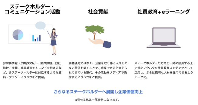 非財務情報の価値を最大化し、企業価値を上げることが私たちのミッションです。このサービスを通じて、日本企業の情報発信の価値を最大化し、情報発信の概念を変えていきます。