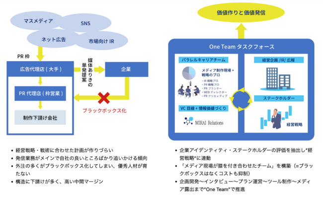 事業開発・PRを通じて先端技術の社会実装を推進する株式会社みらいリレーションズ(本社:東京都渋谷区 代表取締役 齋藤康平)は、パラレルキャリアのスペシャリストが集結し、非財務情報を持続的に発信することで企業価値を上げていく「ステークホルダーリレーションズ “One Team”サービス」を開始しました。