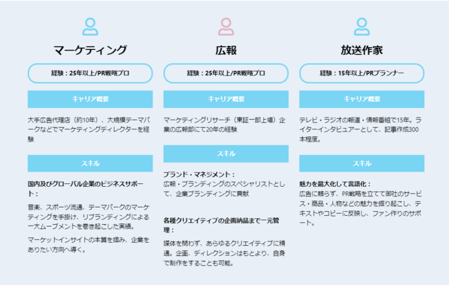 非財務情報作りの旗印となるPR戦略コンサル人材、社内外コミュニケーションを通じて非財務情報を「見える化」するライターや動画クリエイターなどのメディア人材。言語化された非財務情報を適切なタイミングで社内外に発信する広報PR・IR人材など、パラレルキャリアの集団だからこそできるサービスです。