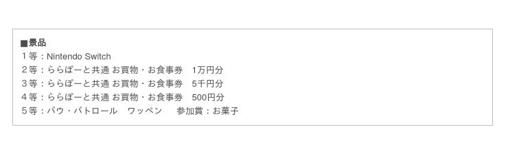 期間中、館内での5,000円(税込・合算可)以上お買上げのレシートをご提示で、お一人様1回限り、Nintendo Switchやパウ・パトロールグッズが当たる「ワクワク抽選会!!」にご参加いただけるキャンペーンを実施します。
