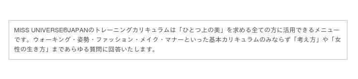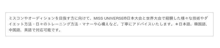その後、MISS UNIVERSE(R)受賞者を多く輩出した指導者により美に対するメソッドを学ぶ。2012年以降は世界基準のファッション・ヘアメイク・ウォーキング・立ち居振る舞いなどの外見の美しさと、メンタル部分の内面を磨いていくワールドクラスビューティーのメソッドを多くの日本女性に指導している。