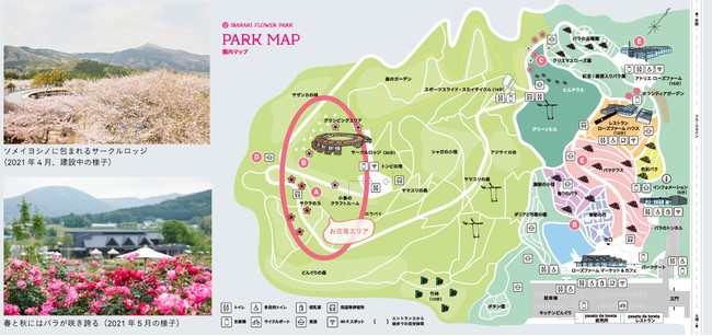 パークエントランスから高低差約100メートル、いばらきフラワーパークに隣接する山の頂のキャンプ&リゾート 花やさと山エリアでは、河津桜、ソメイヨシノ、ヤエザクラが、2月下旬頃から順に見頃を迎えます。
