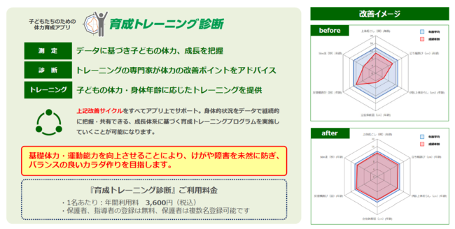 「育成トレーニング診断」は専用アプリで提供されます。測定データを継続的に入力することで、その子の育成・成長を定点観測することができ、専門家の知見による改善ポイントが提供されます。子ども・保護者が同じデータを共有することで、感覚ではない、体系だった育成プログラムを実施していくアプリです。