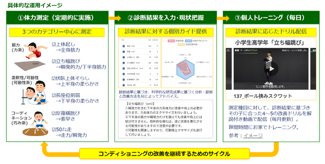 ここで重要な役割を担うのが、「育成トレーニング診断」です。まずは子ども一人ひとりの体力を正しく把握することが求められますが、把握する方法も測定データをどう読むかも、専門家の知見・見識が必須です。そして、その子の体力に応じた体系的かつ継続的なトレーニングを用意してあげることも大変です。子どものバランスの良い体力作りをするために、保護者・指導者をサポートする仕組みが求められています。