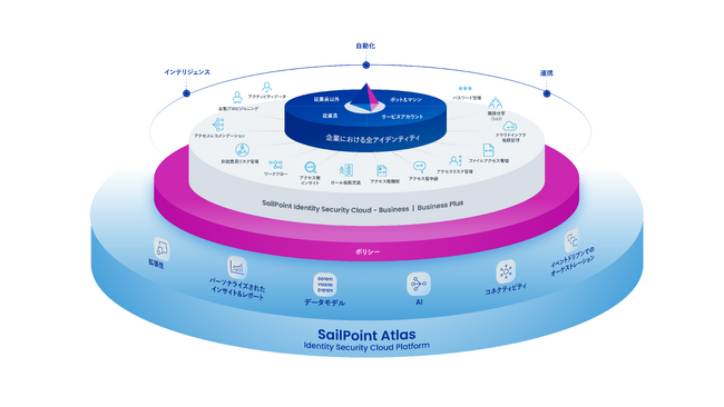 クラウド型統合アイデンティティ管理システムSailPoint Identity Security Cloudの基盤となるSailPoint Atlasは、運用のスピードアップと簡略化を支える重要な共通サービス群であり、豊富なアイデンティティコンテキスト、高度なアクセス履歴とアクティビティに関するインテリジェンス、組み込みAIテクノロジーによって導き出される独自の洞察を提供し、グローバル規模でアイデンティティ・セキュリティプログラムを提供します。Atlasは自動化のためのワークフロー、管理に関するポリシー、スムーズなファブリック接続、一貫性のあるAPI、包括的なデータレイヤーなど、アイデンティティとデータを管理・保護するための強固、かつ統合されたアプローチを先進企業に提供します。