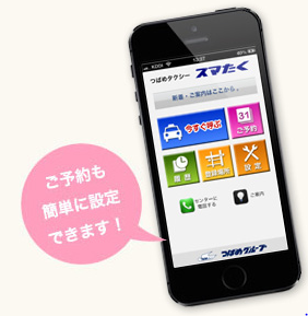 つばめタクシーグループでは、スマートフォンから簡単につばめタクシーグループの車両を呼ぶことができる便利なアプリ「つばめタクシースマたく」を自社で開発している。