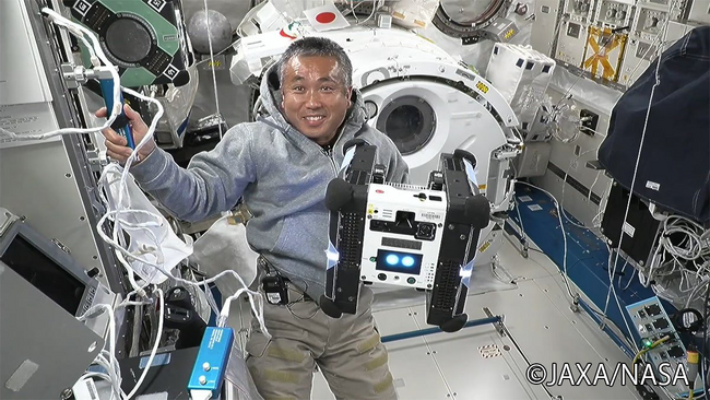 軌道上決勝大会に参加した若田宇宙飛行士と、宇宙ドローンロボット「Astrobee」(画像提供:JAXA/NASA)