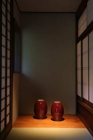 ひとつは、丹後の「丹」から導かれた辰砂釉を用いた新作からなる部屋。もうひとつは、現在の自身と同じ年齢で志賀が発表した作品『豊年蟲』を着想とした新作と美術作家・須田悦弘とのコラボレーションからなる部屋です。