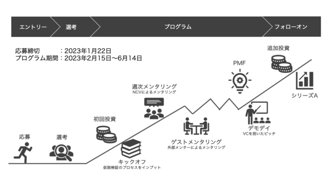 プログラムでは、PMFまでの仮説検証プロセスをレクチャーするキックオフを開催、その後、NVCメンターとの週次メンタリングを通じて、仮説検証を繰り返し、PMFを目指します。