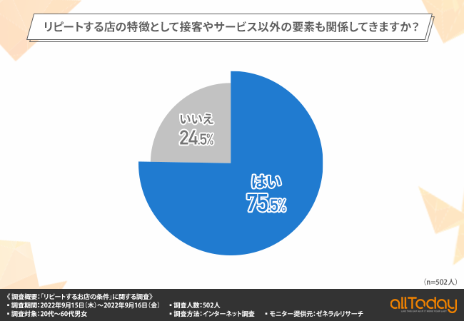 「リピートする店の特徴として接客やサービス以外の要素も関係してきますか?」と質問したところ、8割近くの方が『はい(75.5%)』と回答しました。