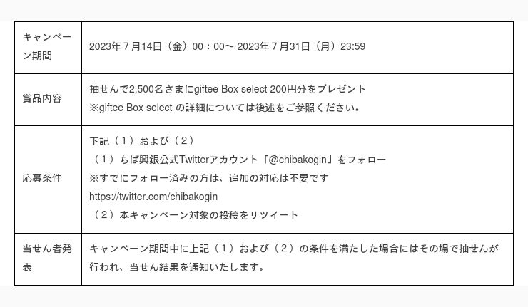 株式会社千葉興業銀行(頭取 梅田 仁司)は、2023年7月14(金)より「ちば興銀Twitter フォロー&リツイートキャンペーン」を実施いたします。