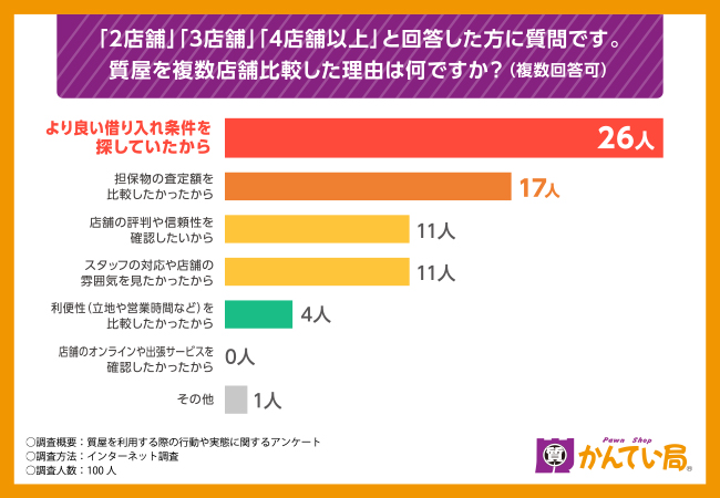 次に「1で『2店舗』『3店舗』『4店舗以上』と回答した方に質問です。質屋を複数店舗比較した理由は何ですか?(複数回答可)」と質問したところ、最も多かった理由は「より良い借り入れ条件を探していたから」で、26人がこの回答を選びました。複数の店舗を訪れて条件を比較することで、利用者はより有利な条件で借り入れを行いたいと考えているようです。