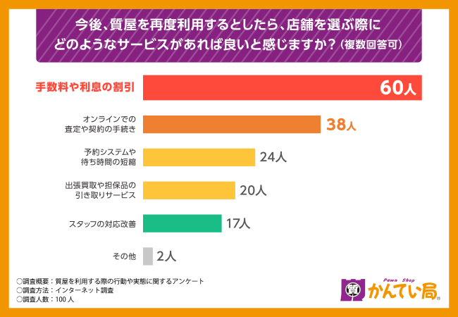 今後質屋に希望するサービス、「手数料や利息の割引」が最多回答数