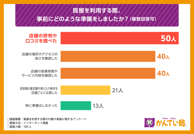 質屋を利用する際の事前調査、「店舗の評判や口コミを調べた」が最多回答数