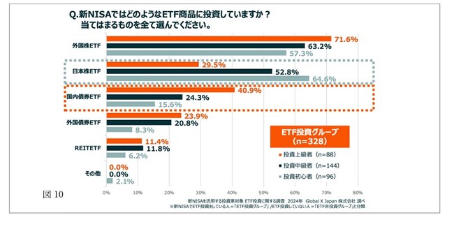 また投資しているETFについては全体的に「外国株ETF」が特に人気がありましたが、投資初心者では「日本株ETF」の割合が最も高く、上級者では「国内債券ETF」が高くなるなど、投資経験による傾向の違いも見られました。(図10)
