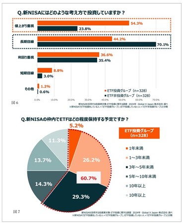 新NISA における投資の考え方としては、ETF非投資グループでは「長期目標」が最も多くなった一方で、ETF投資グループでは「値上がり重視」が最も多くなりました。(図6)