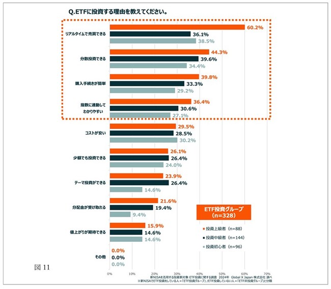 ETF投資グループのETF投資理由は「リアルタイムで売買できる」が最も多い結果となり、投資上級者の約6割が選択しました。次いで「分散投資できる」「購入手続きが簡単」「指数に連動してわかりやすい」といった理由が多く挙がりました。(図11)