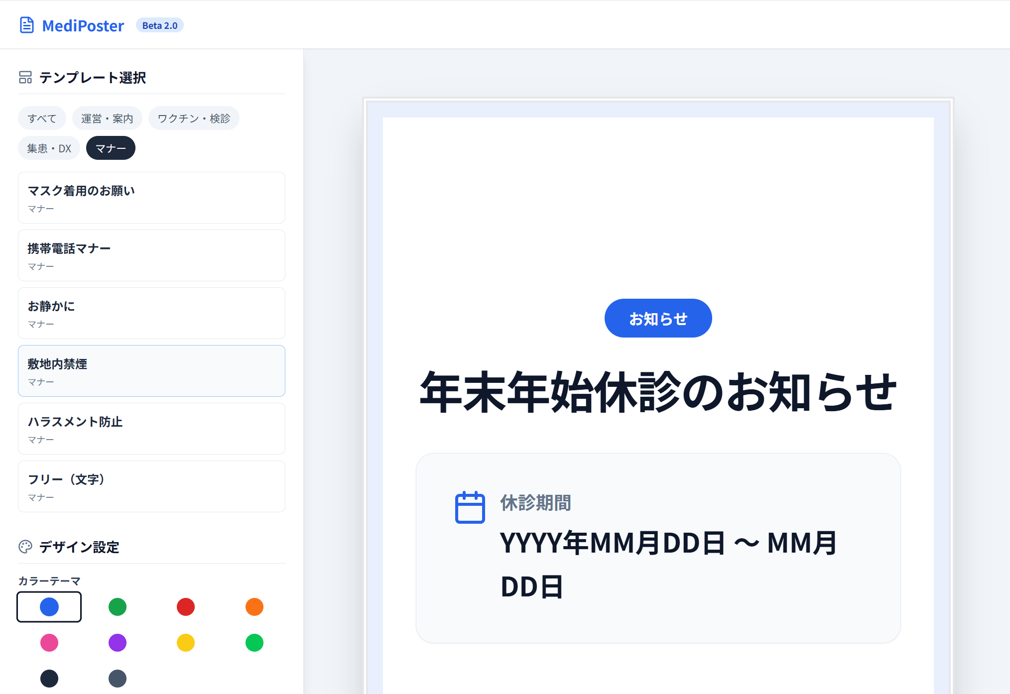 テンプレート例: 年末年始休診、インフルエンザ予防接種、発熱外来のご案内、マスク着用のお願い 等
