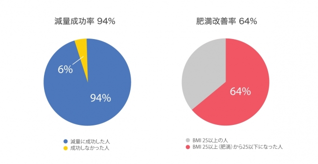 2015年、リクルートライフスタイルの従業員75人を対象に実証実験を行いました。その結果、75人の参加者のうち70人(94%)が減量に成功。(平均減量数2.8kg、最大減量数9.2kg)さらに、肥満と定義されるBMI 25以上の参加者の64%はBMIが25未満まで改善し、多くの方の肥満を解消する結果に繋がりました。詳しくは、Noom 2015年リクルートライフスタイル実証事業レポートをご覧ください。(リンク:http://www.noom.com/jp/?p=3040)