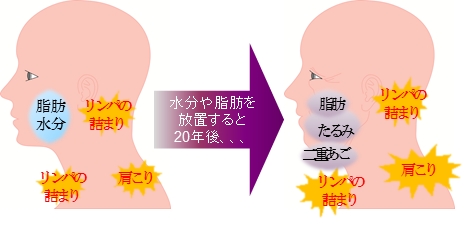 首、肩、デコルテ周りに詰まりやコリがあると、頬に脂肪や水分が蓄積されやすく、更にそれを長期間放置すると、加齢とともにたるみや二重あごとなって重さから耐えられず皮膚も伸びて下垂させてしまいます。