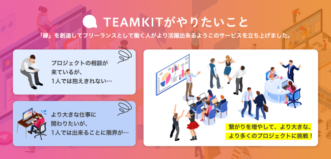 「TEAMKIT」は、フリーランスなどの個人がプロジェクトをシェアできるプラットフォームです。「仕事の依頼が多くきているが、 1人では抱えれきれない」「もっと大きなプロジェクトにも挑戦したいけど、1人でやれることには限界がある」といった悩みを抱えるフリーランスをサポートします。