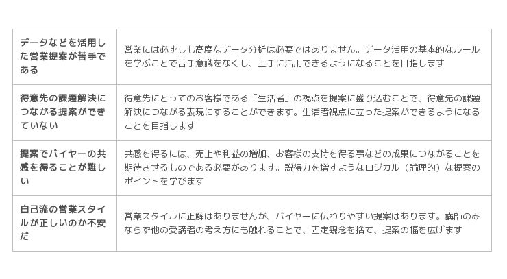 講義とグループ演習を通じて、データを活用したロジカルな説明や生活者視点に立った得意先に響く提案をおこなうための基礎力を養う、若手営業のスキルアップに特化した新規に開設する講座です。