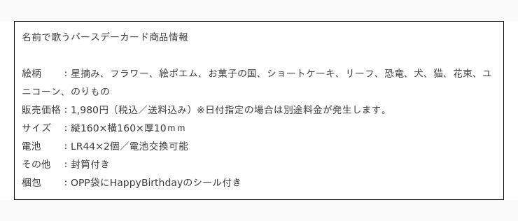 「誕生日の方のお名前を入れる」ことができる世界で唯一の名前入りバースデーソング付きカード。