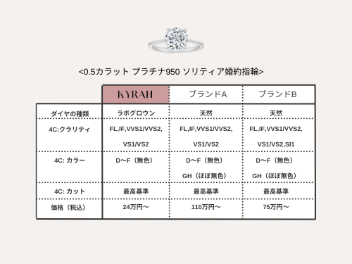 そこでKYRAH では高品質ながらも手の届きやすい価格であるラボグロウンダイヤモンドを用いることで、女性たちが理想としている0.5カラット以上のダイヤモンドリングを婚約指輪にかける平均予算35万円以内でお届けすることを目指しました。