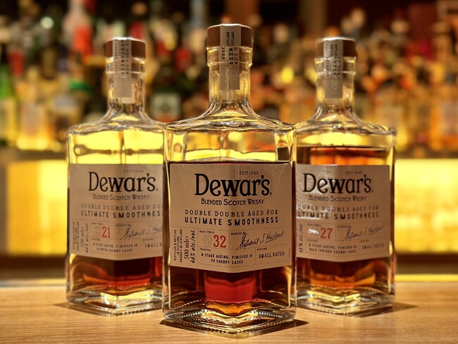デュワーズダブルダブルシリーズは、熟成された数十種類のモルトウイスキーとグレーンウイスキーをそれぞれ混ぜ合わせた後に、樽の中に入れて後熟。その後モルトウイスキーとグレーンウイスキーを再度ブレンドし、樽で3度目の熟成。仕上げに21年、27年、32年ごとにそれぞれの樽でフィニッシュさせるという、手間と時間を惜しまない4段階の熟成プロセスを経た、デュワーズ市場最高峰のシリーズ。特に32年は2020年 International Whisky Competitionにて最高峰の賞であるウイスキー・オブ・ザ・イヤーを受賞した、世界的に認められているウイスキーです。