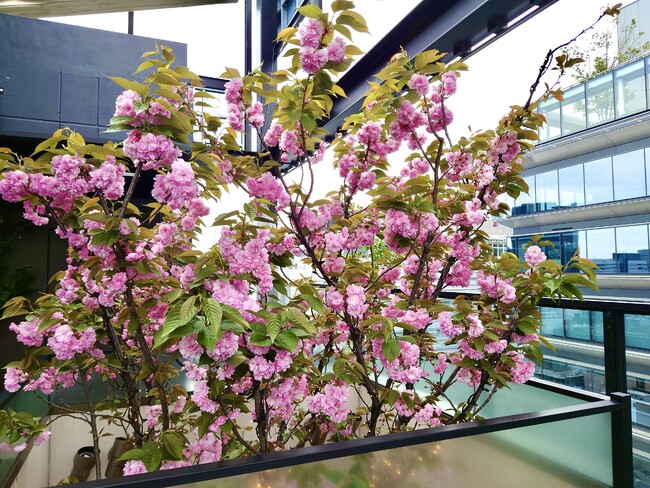 サクラマークス612ビルの最上階に植えられたシンボルツリー、樹高10メートルの八重桜が満開を迎える時期となりました。八重桜は、お花見に一般的なソメイヨシノよりも開花の時期が遅く、長い時間咲き誇るため、お花見をもう一度したい方や、お花見をし損ねた方にもぴったりな桜です。