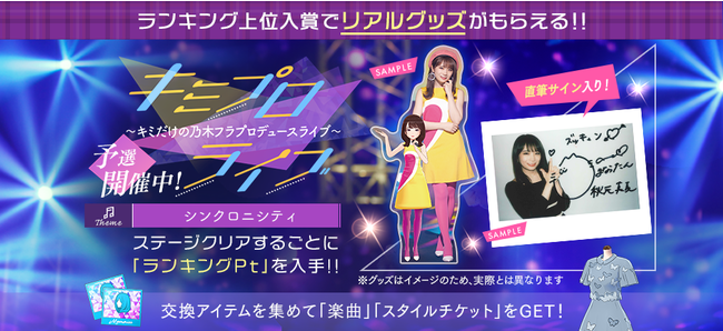 乃木フラではメンバー直筆サイン入りリアルグッズなどが報酬として貰えるイベント「キミプロライブ#02」を開催しております。キミプロライブは、ステージクリアでランキングPtを入手し、他のユーザーと競い合うランキング形式のイベントとなります。 推しのメンバーを1人選び、それぞれの推しメンランキングに参加することができます。今回の推しメンランキングのリアルグッズ報酬は、乃木坂46各メンバーの「直筆サイン入りチェキ」、「アクリルスタンド」をご準備させていただきました。また、本イベントから総合ランキング報酬にもリアルグッズ報酬の「アクリルスタンド」が追加され、ランキング報酬の他にも抽選報酬が用意されているので、ゲームに慣れていない方も気軽にイベントへ参加してみてください。