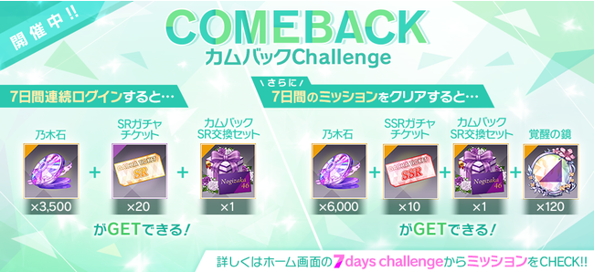キャンペーン開始時点で一定期間ログインを行っていなかった方を対象とした、カムバックキャンペーンを12月28日(火)AM5:00より開催いたします。ゲームにログインするだけで「好きなメンバーのSR」を自由に選べる「カムバックSR交換セット」や「ガチャチケット(SR)」が入手できます。さらに、メンバーの育成やライブ挑戦などミッションをクリアしていくことで、最大6,000個の「乃木石」や「ガチャチケット(SSR)×10枚」なども獲得できます。この機会に、是非乃木フラをプレイして豪華報酬を手に入れましょう!