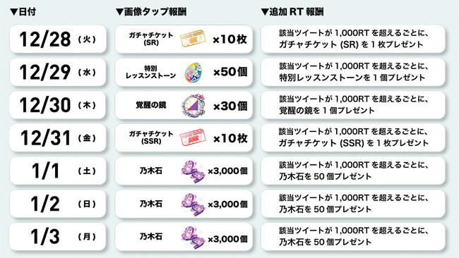 キャンペーン期間中、乃木坂的フラクタル公式Twitter(@nogifra)にて、ゲーム内アイテムが毎日貰える「7days Twitterキャンペーン」を開催いたします。日替わりの投稿に添付された「画像」をタップするだけで、その場で「ゲーム内アイテム」がもらえ、さらに、該当ツイートのRT数が1,000RTを超えるごとにユーザー全員に報酬を配布いたします!